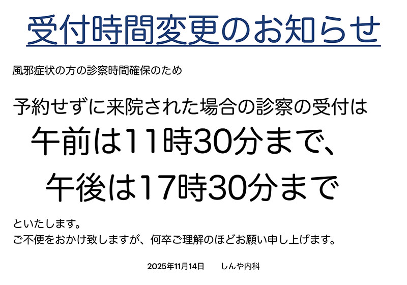 風邪症状のかたの診察時間確保のため、予約せずに来院された場合の診察の受付は